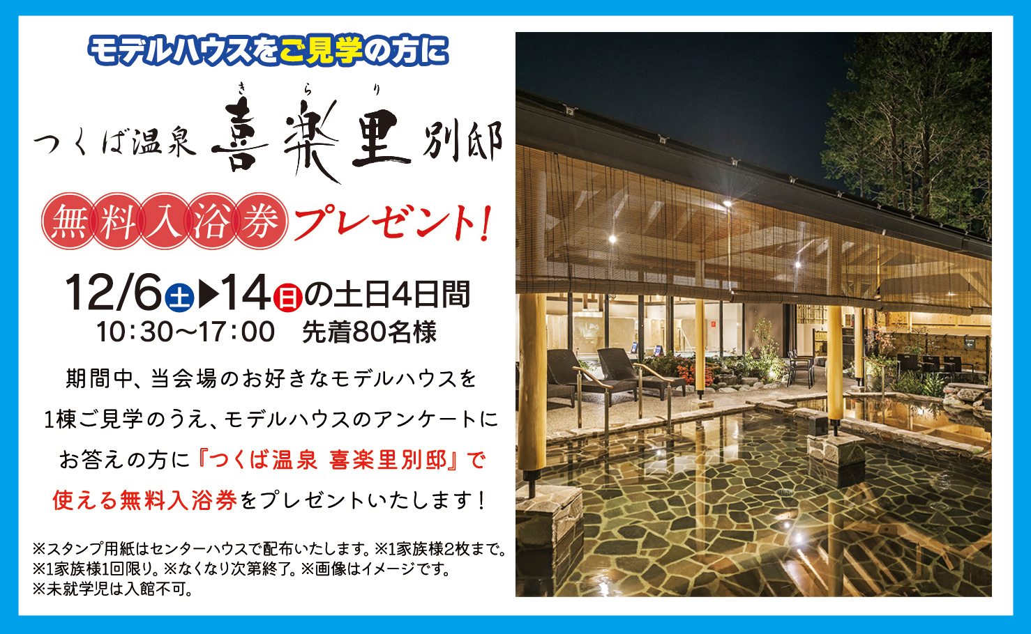 モデルハウス1棟ご見学いただいた方に、「つくば温泉 喜楽里別邸」で使える無料入浴券をプレゼントいたします。