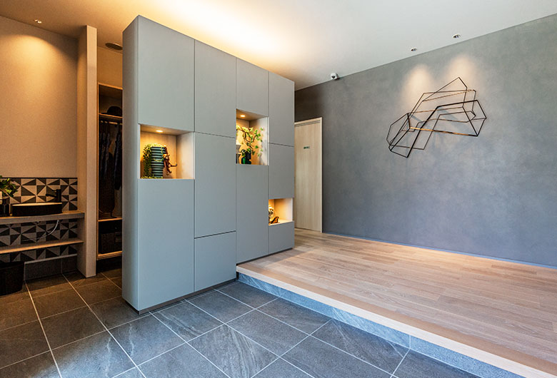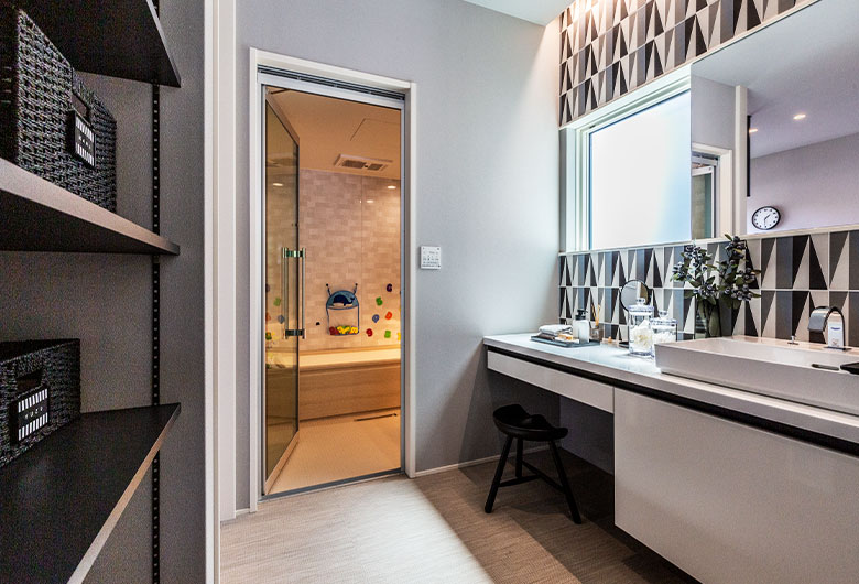 玄関にはチェンジングルームと洗面台をご用意。LDKにウイルスを持ち込まない工夫をしております。LDKは約36帖あり、天井高2700mm、南側には8mの大開口サッシを採用。積水ハウスのファミリースイートにより、壁柱のない大空間LDKを実現しています。キッチン、サニタリー、ランドリーが近い家事動線を意識した間取り。家事効率にご配慮したい方には必見です。また、次世代IoTの技術を使った、プラットフォームタッチを完備している展示場になっています。携帯端末とお家が連動している技術、是非ご体感下さい。