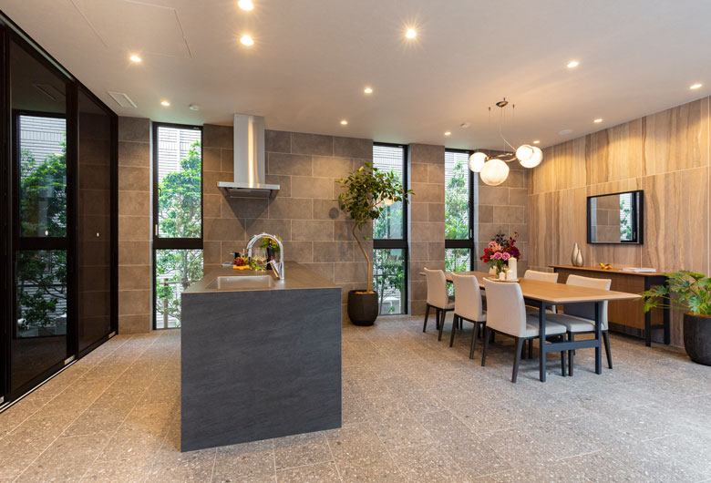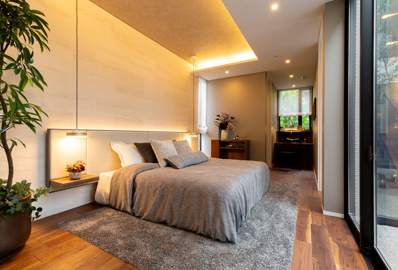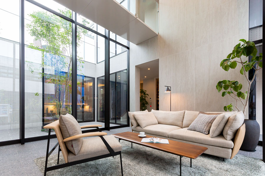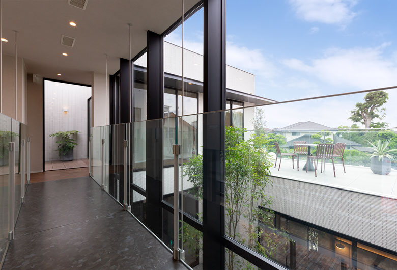 中庭を中心としたコートハウスの形式をとることで内に向かって開き、プライバシーを守りつつ開放感を得られるようにした空間設計です。吹抜空間の開放感を損なわないよう、2階をつなぐ吊廊下の床面をスチールでつくり、極限まで薄く軽やかなデザインとしました。