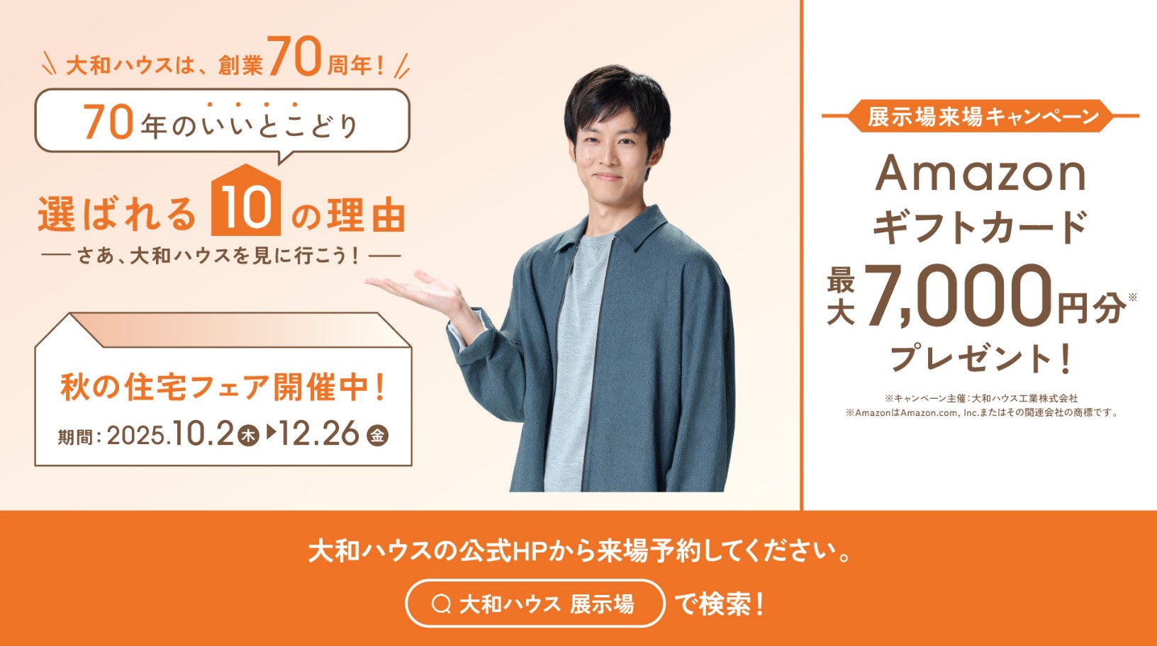 2025年10月2日~12月26日の期間中、大和ハウスの公式WEBサイトから「住宅展示場」にご予約の上、ご来場いただいた方には「Amazonギフトカード4,000円分」をプレゼント。さらに、各種相談(AIプラン診断、ファイナンシャルプランナーによるライフプラン相談(無料)、土地の敷地調査、物件見学、建物見学)の次回の商談を予約&実施いただいた方には「Amazonギフトカード3,000円分」をプレゼントします。