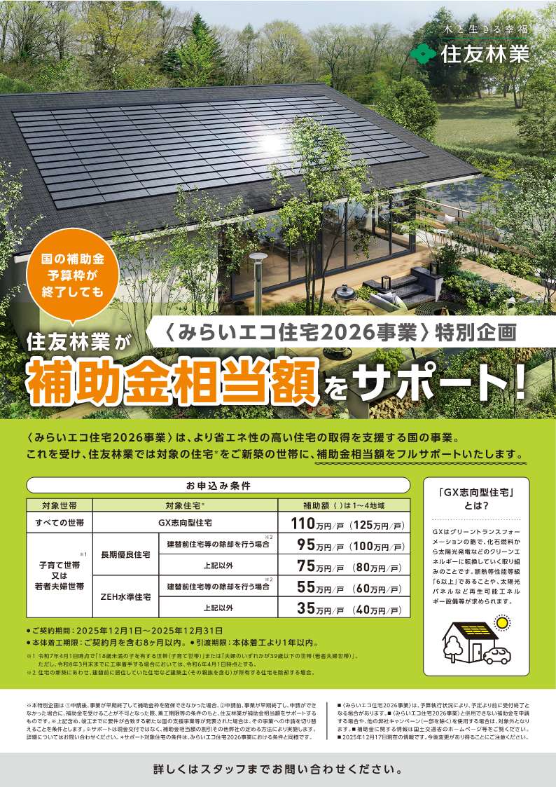 この度、国の「みらいエコ住宅2026事業」に関連し、住友林業で特別サポート企画をご用意いたしました。