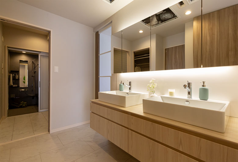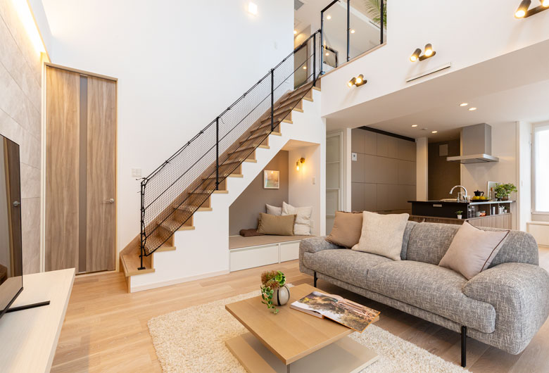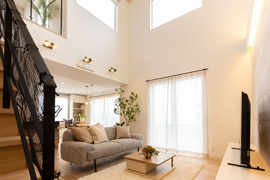 LDKでは大きな吹き抜けが広々と開放的な空間を創り出し、その中にウィンドウソファーやヌック等を配置して自然と家族が集まる空間になっています。