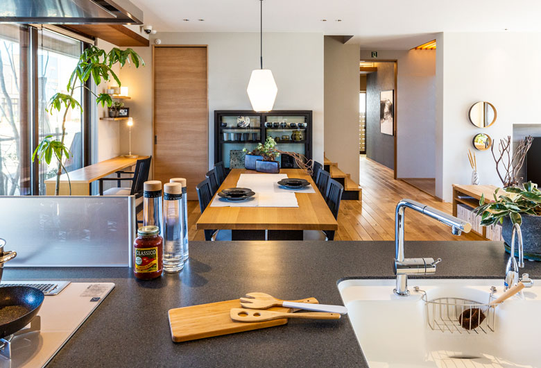自然美と伝統美を備えた和の趣の中に融合された和モダンの住まいには国産ナラの無垢材を贅沢に採用