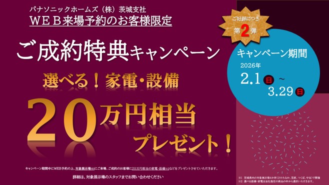 パナソニック ホームズHPからWEB来場予約のお客様限定でご成約すると、選べる!家電・設備・家具20万円相当プレゼント!!