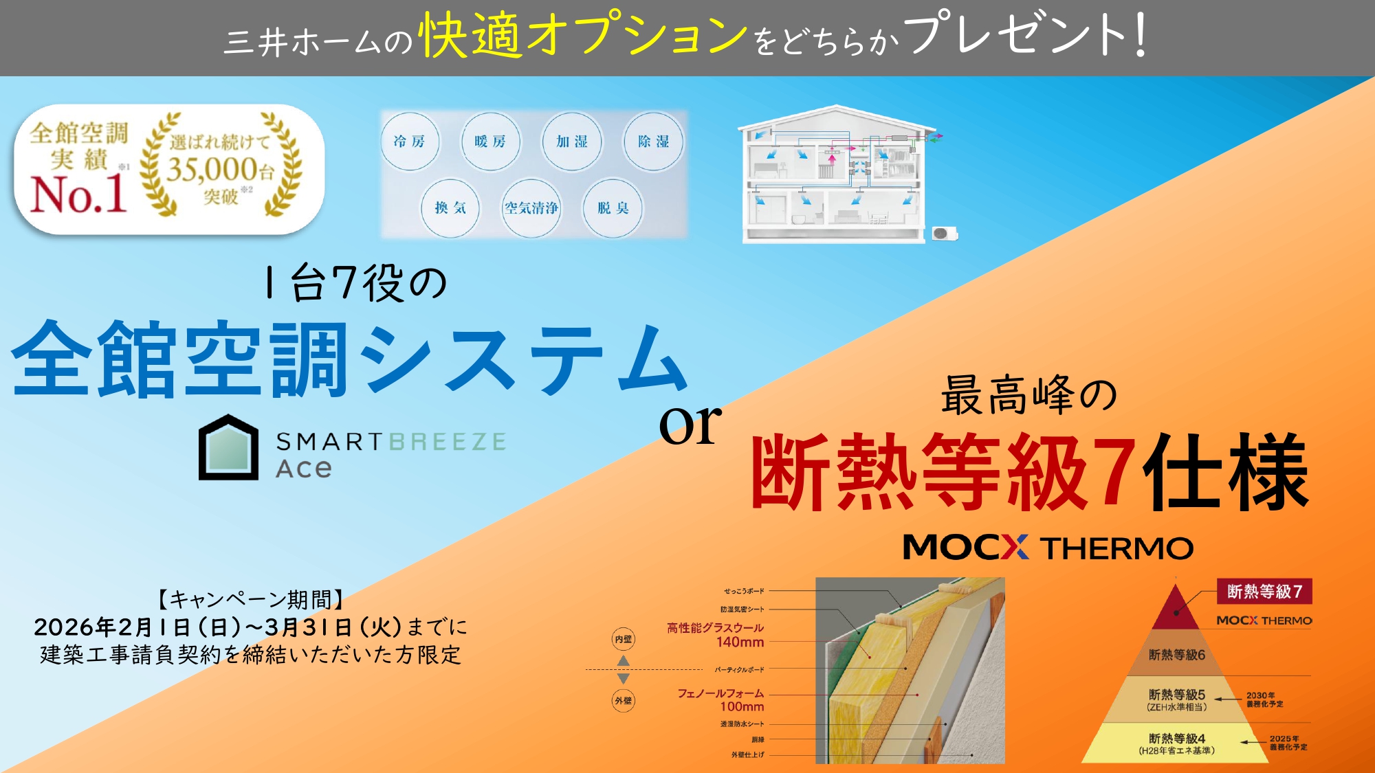 快適オプション『全館空調システム』もしくは『断熱等級7仕様』のどちらかをプレゼント!