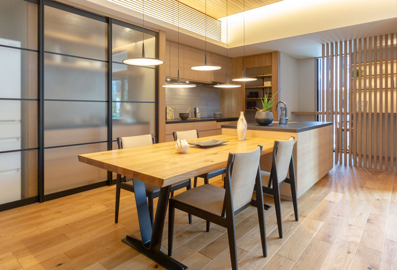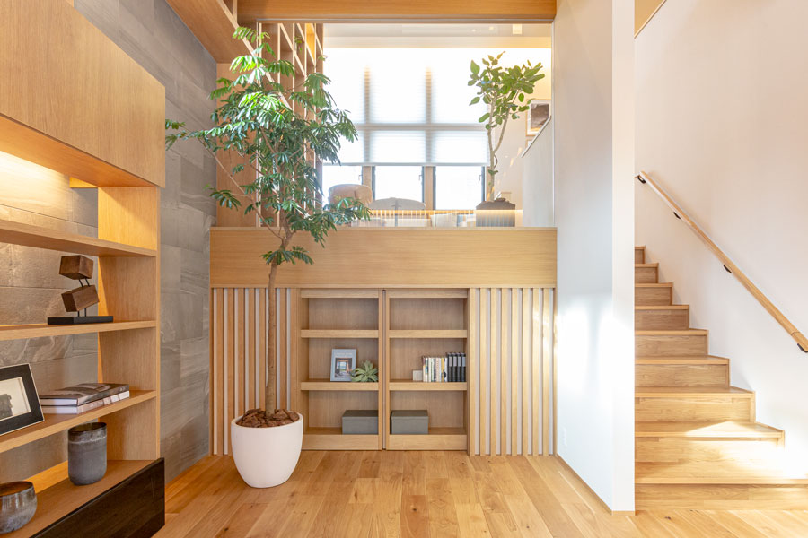 国産檜材を内装材に豊富に使用し、品質も優れた高耐震・高断熱の和モダン住宅です。