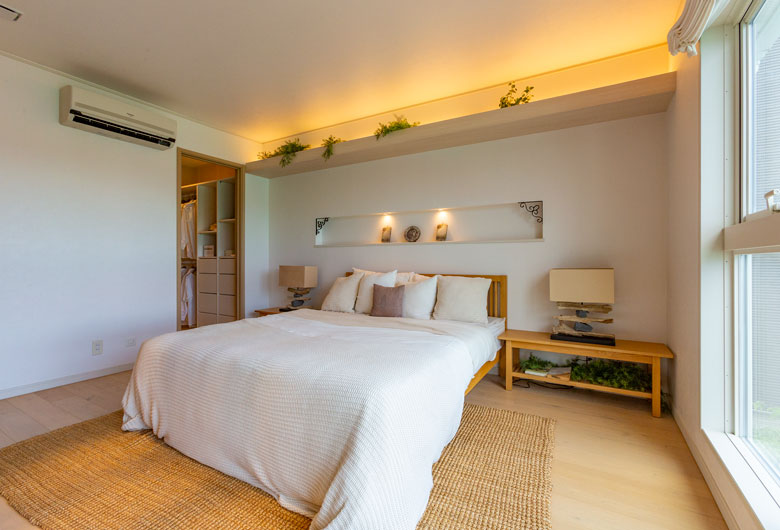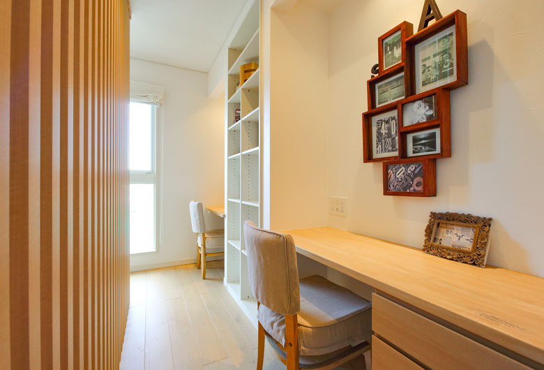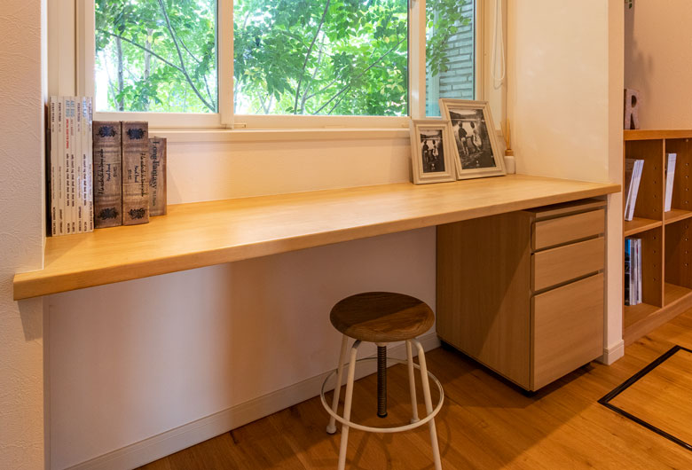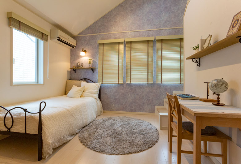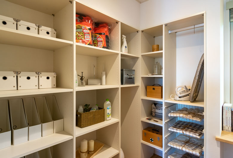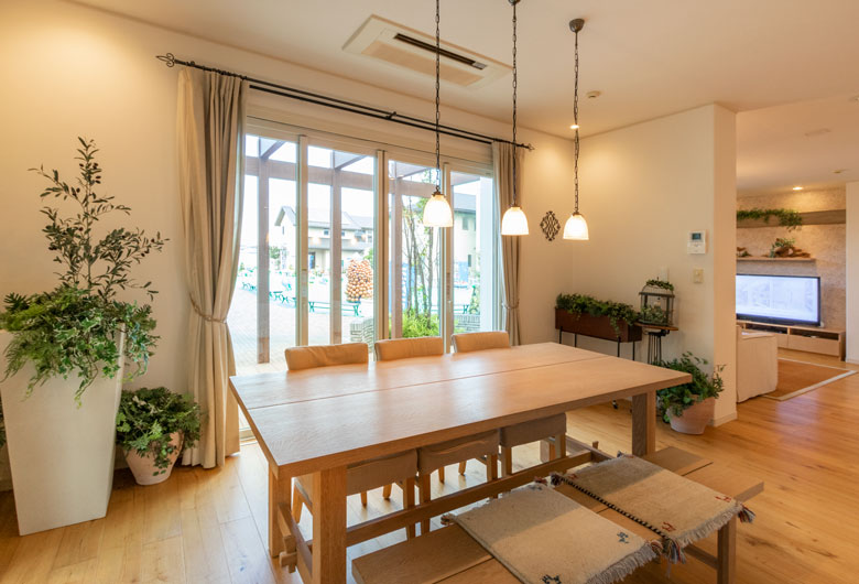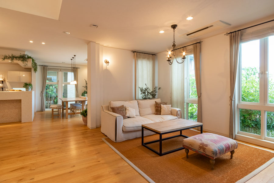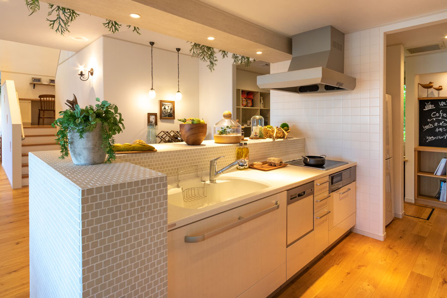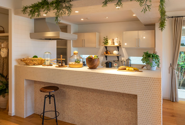 「ラスティック(素朴さ)」なフレンチカントリーをテーマに、モザイクタイルやグリーン、化粧梁など、素朴感にこだわったアイテムでインテリアをコーディネートしています。また、間取りは回遊性の高いキッチンを中心に、リビング、ダイニングと開放的な空間が広がります。さらに、2階に配した効率的な水まわり動線や、しまうモノを想定して計画された適材適所の収納、各所に設けられた造作化粧棚など、デザイン面だけでなく住んでからの使い勝手や快適性にも配慮しています。