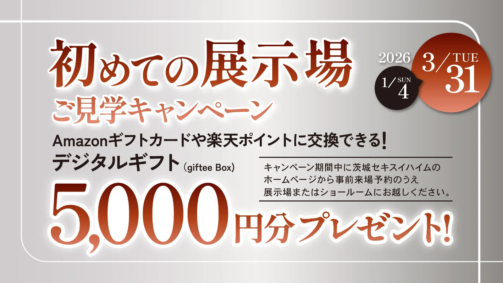 茨城セキスイハイムのホームページから事前来場予約のうえ、展示場またはショールームにおこしいただくと「デジタルギフト 5,000円分」をプレゼント!
