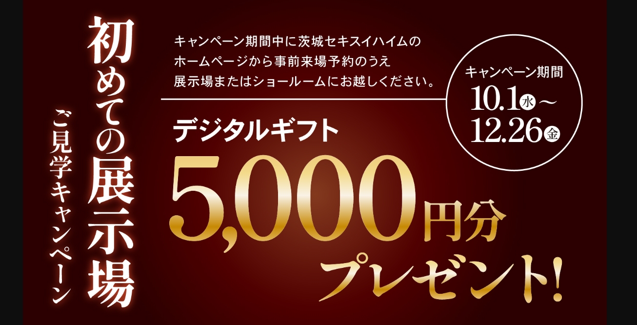 茨城セキスイハイムのホームぺージから事前来場予約のうえ、展示場へお越しいただくと、「デジタルギフト5,000円分」をプレゼント!