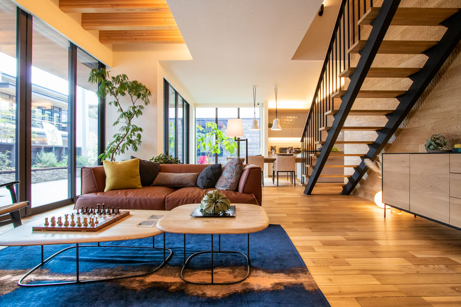 ビッグフレームが実現する大開口・開放感、世界の銘木と天然石が醸し出す高級感とハイセンスなインテリアを設えたワンランク上のモデルハウスです。丁寧な素材選択と照明計画で、何気ない日々の暮らしに、ゆとりを感じる豊かな時間を演出します。共働き夫婦のための家事動線や収納計画。家族の気配を感じる空間設計を是非ご体感ください。