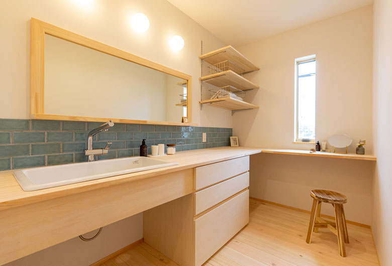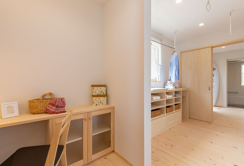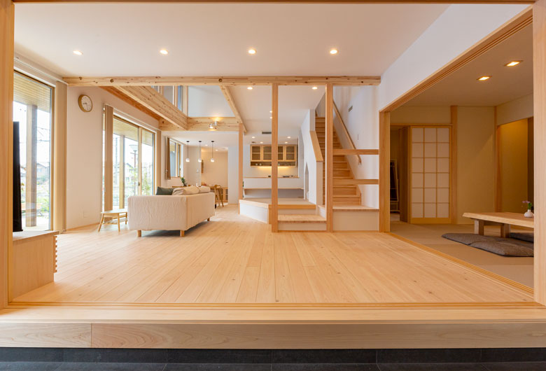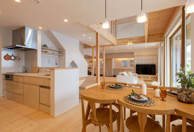 深い軒が落ち着きを感じさせる飽きのこない外観。玄関の引き戸を開けると、木の香とともに土間空間が広がります。大きな吹き抜けのあるリビングは、梁表しの開放的な仕上げ。中央にある小上がりは、食卓、書斎、だんらんの場として多目的に活躍します。ぐるっと回れる間取り、キッチン後ろの洗濯動線、子どもの好奇心をくすぐるヌック。暮らしのシーンをカタチにした間取りは、居心地のよさだけでなく、毎日の動線や収納まできちんと考えらています。国産ひのきの香りや足ざわりは、ぜひ展示場で体感してください。