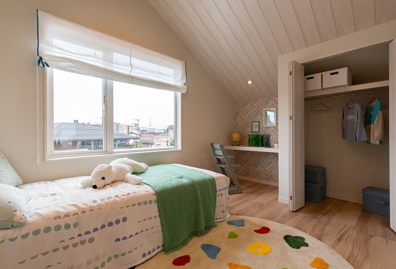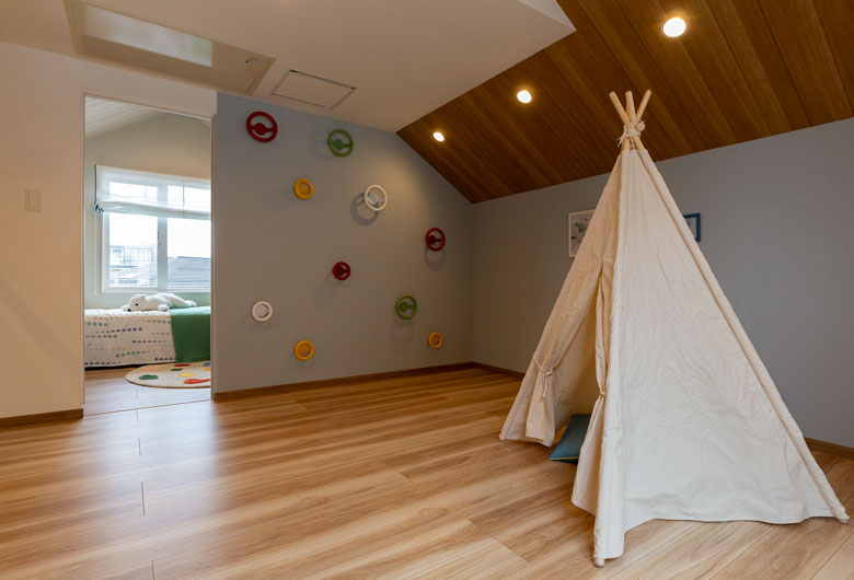 全館空調”Z空調”を搭載した、2世帯住宅。1階は親世帯の居室空間。2階、3階は子世帯の居室。2階リビングは3階へ続く屋根勾配を用いて開放感を演出。3階はアトリエ。子供部屋が秘密基地に。そして屋上庭園、青空リビング。太陽と青空を感じられるプライベート空間です。