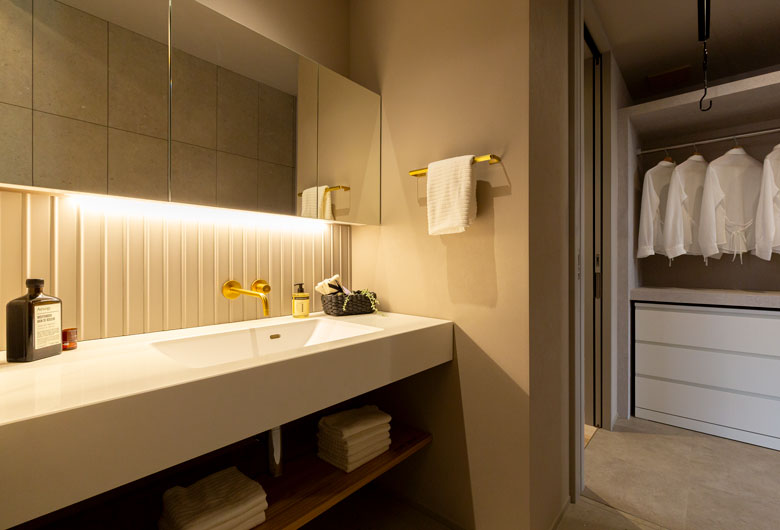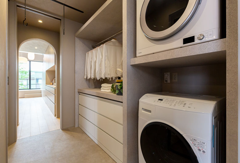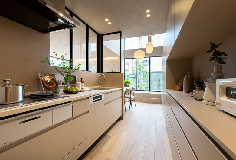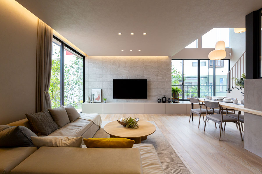 グレーや木目を基調とした柔らかく落ち着いたコーディネートとしており、リビングやワークスペースに面した大きな窓やDK上部の吹抜けが明るく開放的な空間を演出しております。スムーズに家事が行えるよう、キッチンからランドリールーム、風呂、洗面といった水廻りは回遊できる同線計画になっております。また住宅設備機器や家電等をスマートフォンから遠隔操作できるIoTシステムも導入いたします。また、EV(電気自動車)向け屋外コンセントの標準装備をいち早く体感できます。
