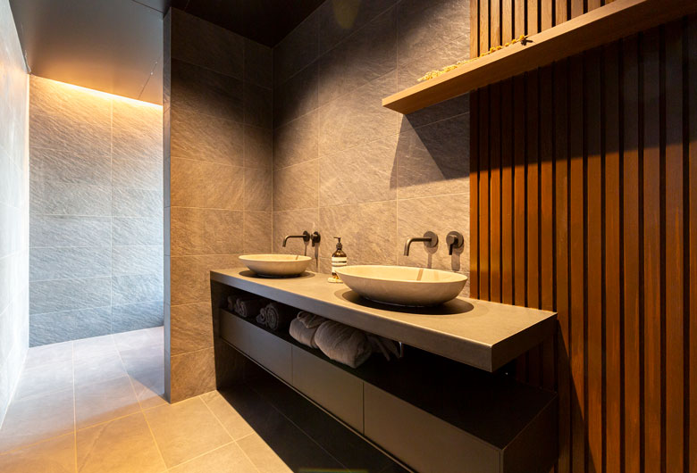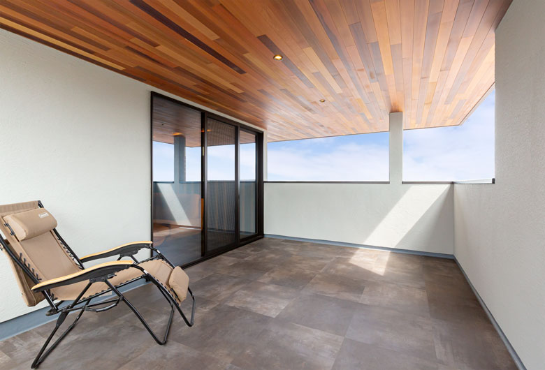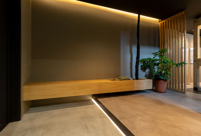 2階のモデルルームでは石や植栽、無垢材など自然の要素を取り入れたモダンデザイン。