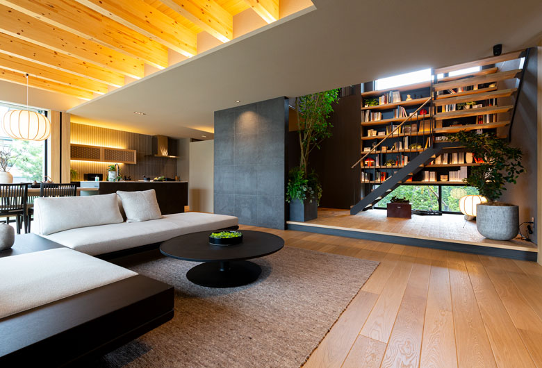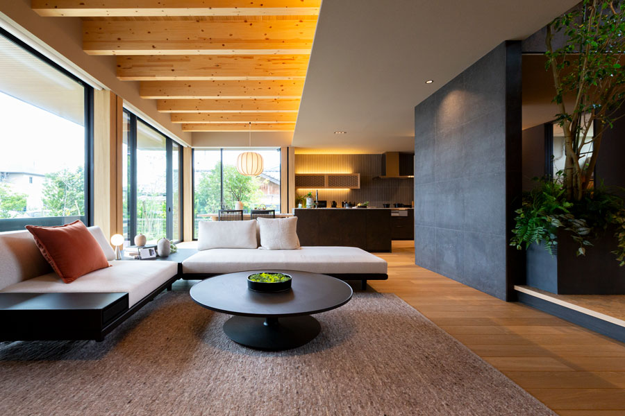 独自の構造で高い耐震性を実現しつつ、木質感と開放感あふれる上質な住まいとなっております。皆様のご来場を心よりお待ちしております。
