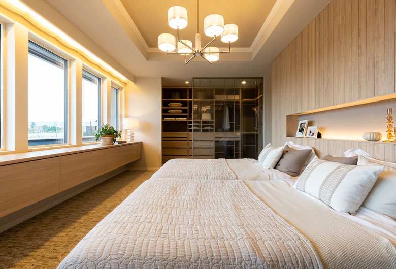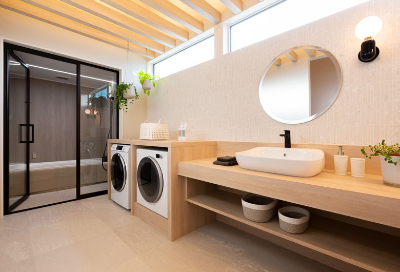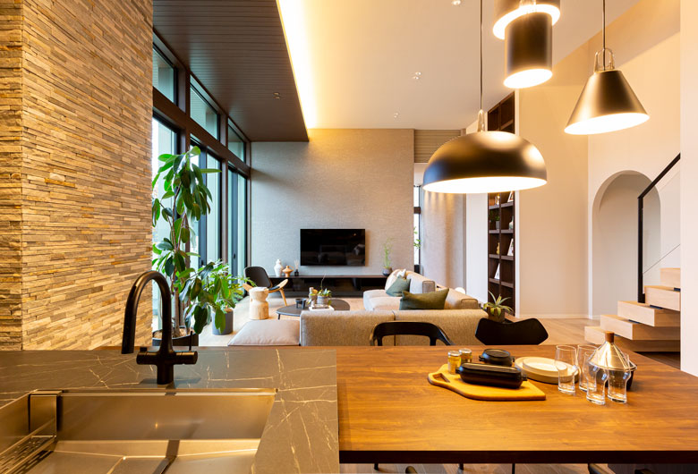 明るい色調の中で実現した新しいラグジュアリーデザインと、内と外を一体に見せる空間設計や、スキップ空間、家事動線など見どころ満載です。