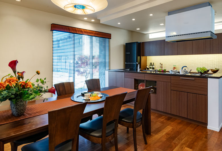 和モダンの広々としたキッチンからリビングへ繋がる空間は約30帖。リビングの天井は吹き抜けで、柔らかな日差しが差し込む窓も設置。常に明るくゆったりとできる大空間。スキップフロアはリモートワークに最適な場所に。建物全体が全館空調で室温を保ち、高い省エネ性も実現。毎日の家事も負担にならない様に、家事動線を一直線にし、時短を叶えます。家族みんなが心地良く、どこに居ても家族の気配を感じられる「つながる家」をご体感下さい。