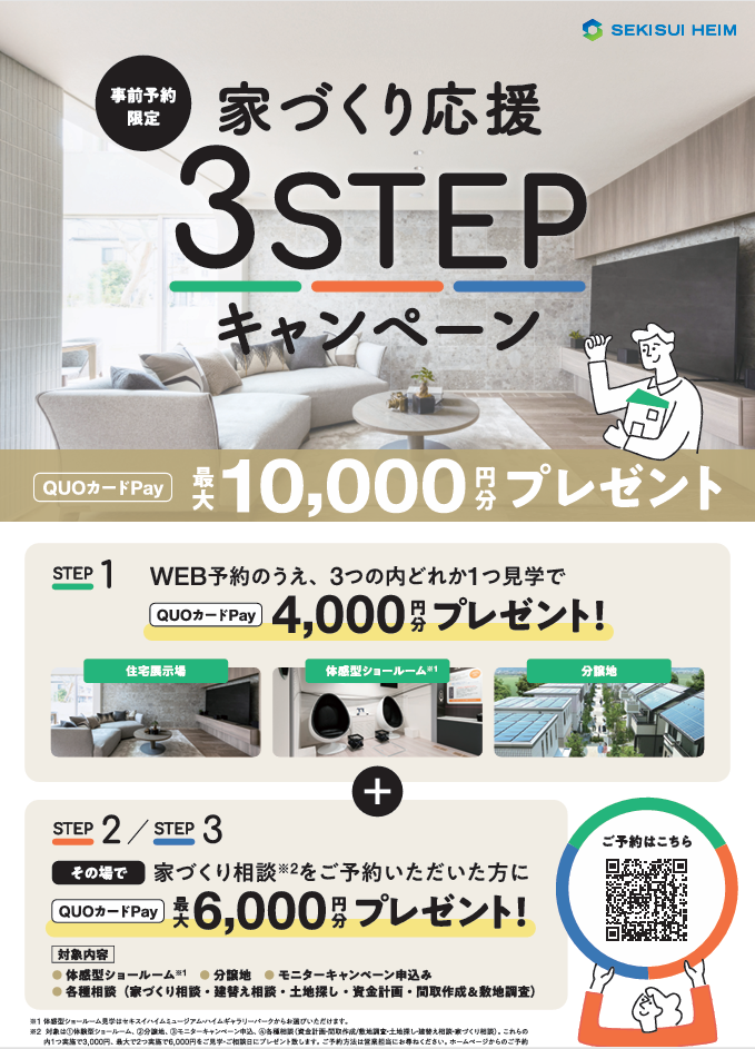 事前WEB予約の上「住宅展示場」「体感型ショールーム」「分譲地」の内どれか1つご見学でQUOカードPay4,000円分プレゼント!