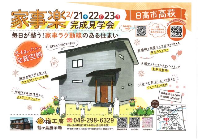【2月21日(土)、22日(日)、23日(月)10:00~16:00】に【日高市高萩】での完成見学会が開催されます!
