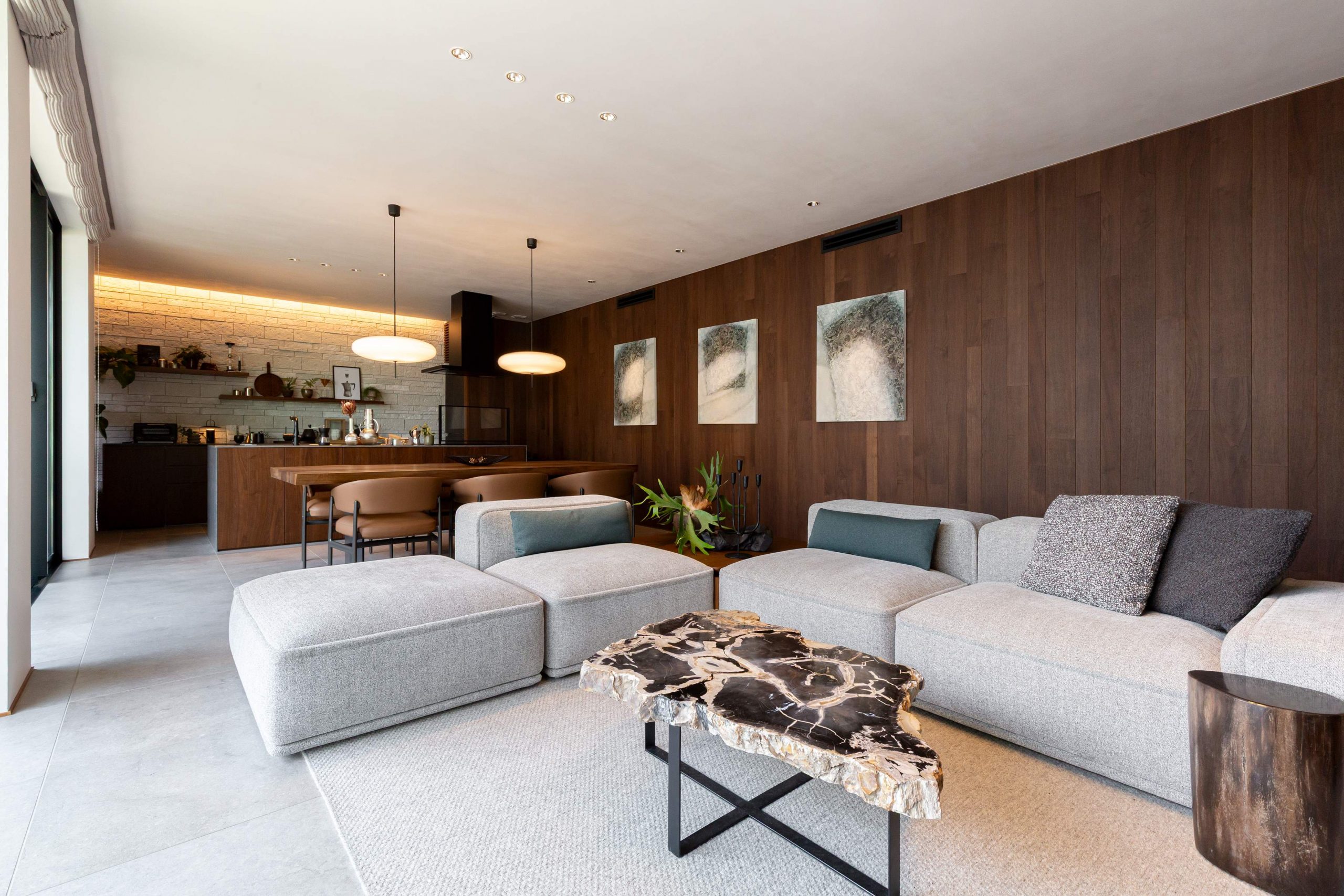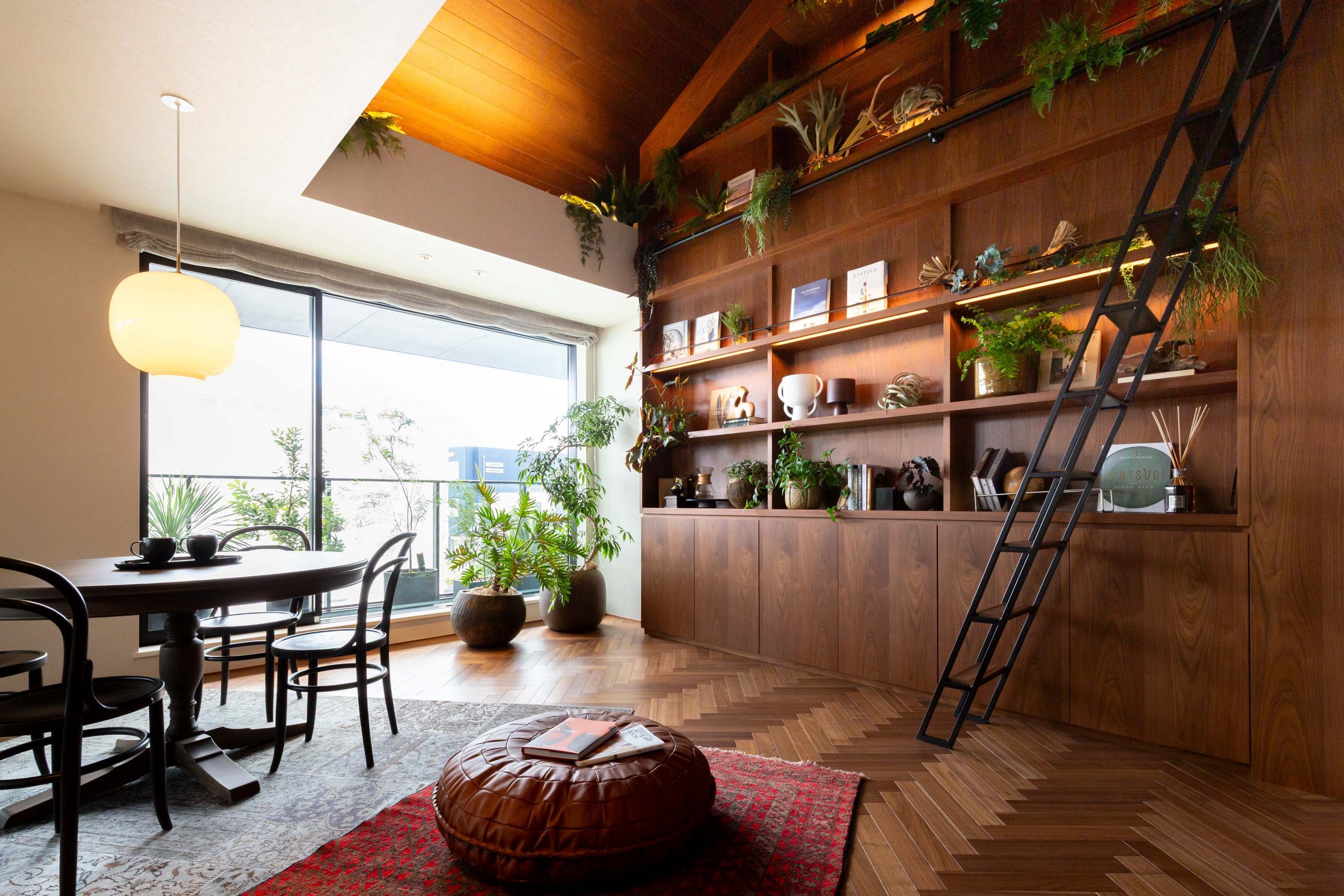 階高を上げた大きな壁面を木貼り仕上げとし、シックにまとめたヴィンテージモダンのインテリア