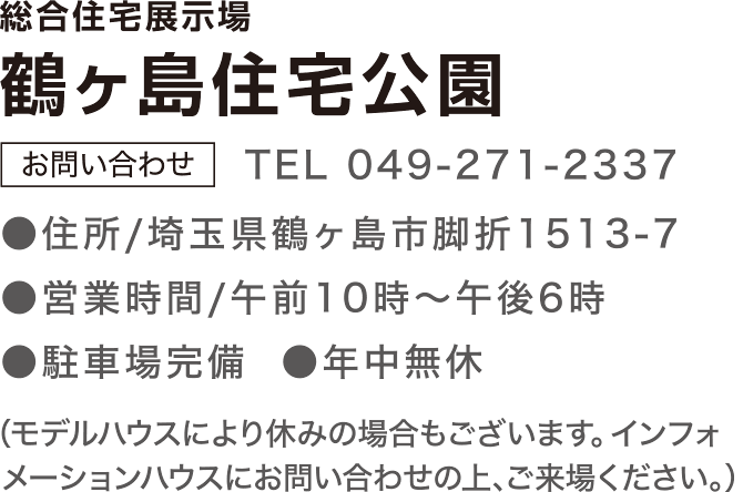 総合展示場 鶴ヶ島住宅公園 お問合せ TEL:0492712337 総合展示場 鶴ヶ島住宅公園 お問合せ TEL:0492712337
