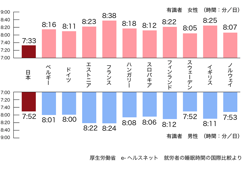 日本人の睡眠時間は少ないといわれています。下の図のように欧米の多くの国々の人の平均が8時間を超えているのに対し、日本人は男女ともに8時間未満となっています。特に女性は家事や育児の負担が大きいといった理由で、男性よりも短い傾向があります。