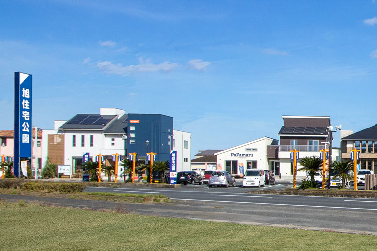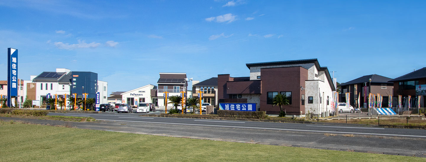 国道126号沿いの抜群のロケーション。間口100mで注目度が高い。全棟南向き又は西向きで実際に建てる場合、非常に参考となる。L型レイアウトを取り駐車場ですべてのモデルハウスが見渡せるので外観の比較が容易である。80台の大駐車場完備。