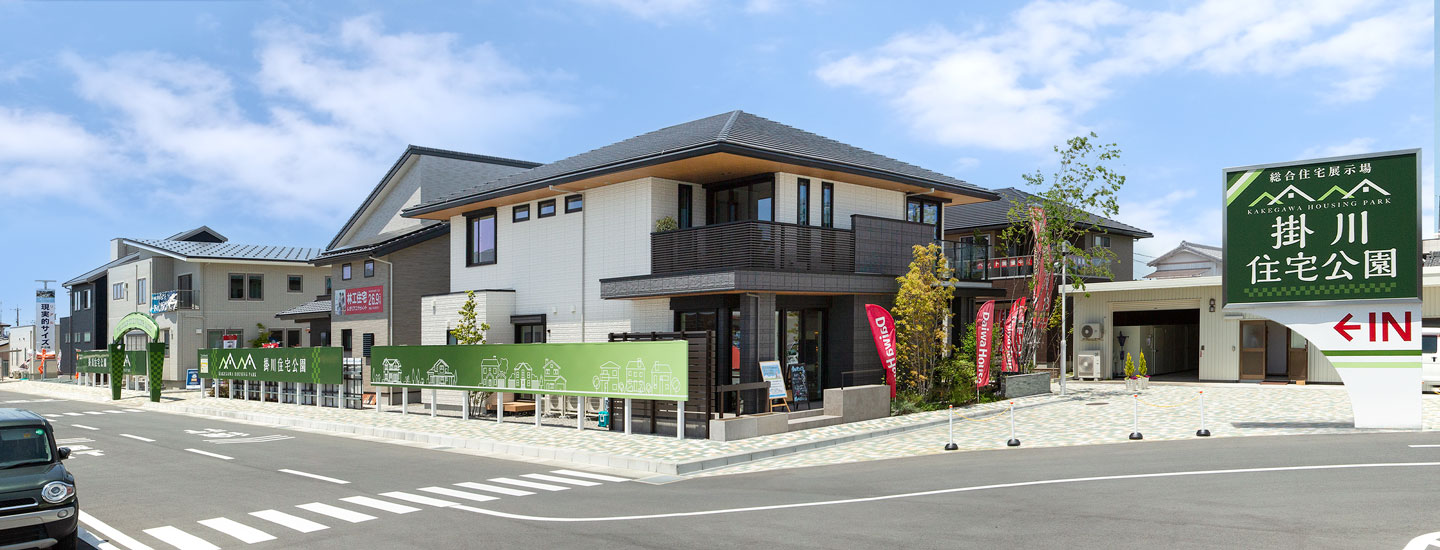 掛川バイパス西郷ICより約1km、掛川城を臨む地に新たな総合住宅展示場が誕生しました。会場は素敵なモデルハウスが建ち並び、気軽に立ち寄れる散歩道をイメージしました。