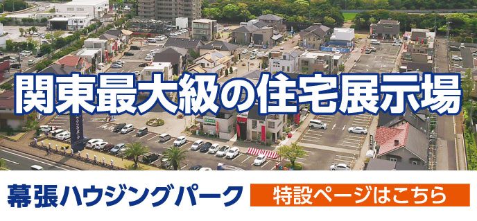 千葉県内の住宅展示場の中で出展社数、出展棟数ともに関東最大級 全48棟のモデルハウスが揃っています。また車でご来場の場合は、東関東自動車道・習志野IC並びに京葉道路幕張ICから近く、国道14号線沿いに広く面していますので非常に分りやすい。また電車の場合でも、JR総武線「幕張」駅又は京成線「京成幕張」駅より徒歩15分の好立地条件です。
