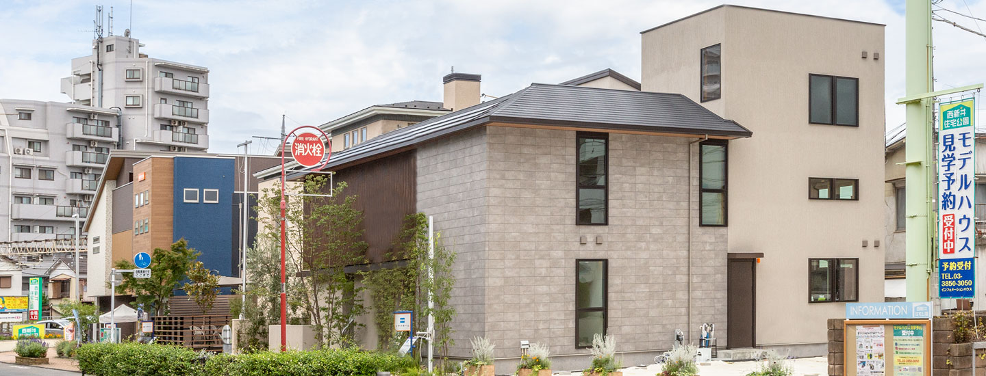 東武線「西新井駅」東口から徒歩1分、環七通り、西新井陸橋わきにある住宅展示場です。昭和49年にオープンして以来、皆さまの夢を叶え続ける伝統の住宅展示場となっております。