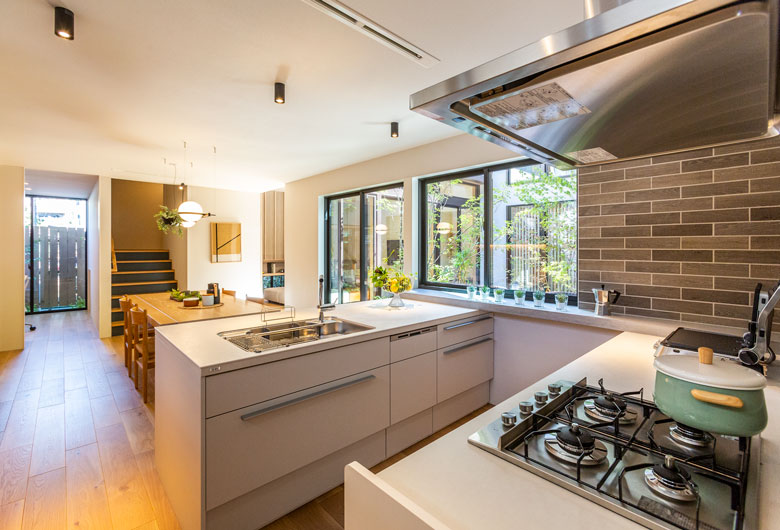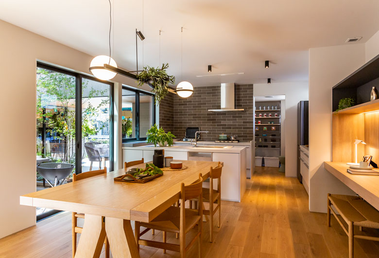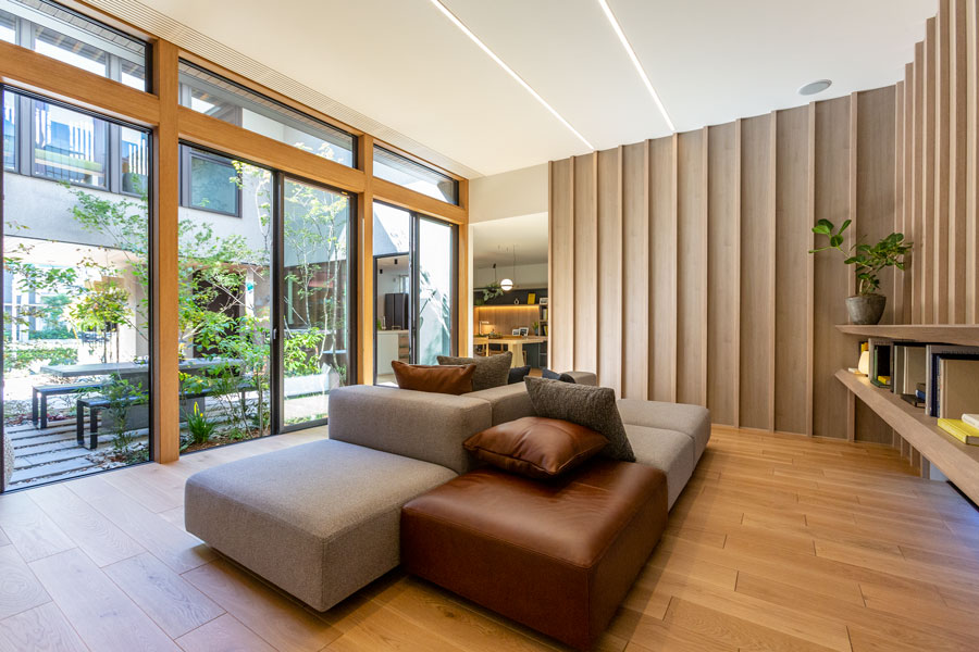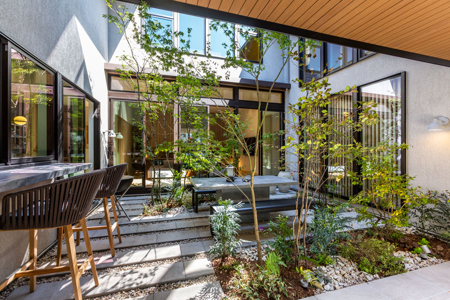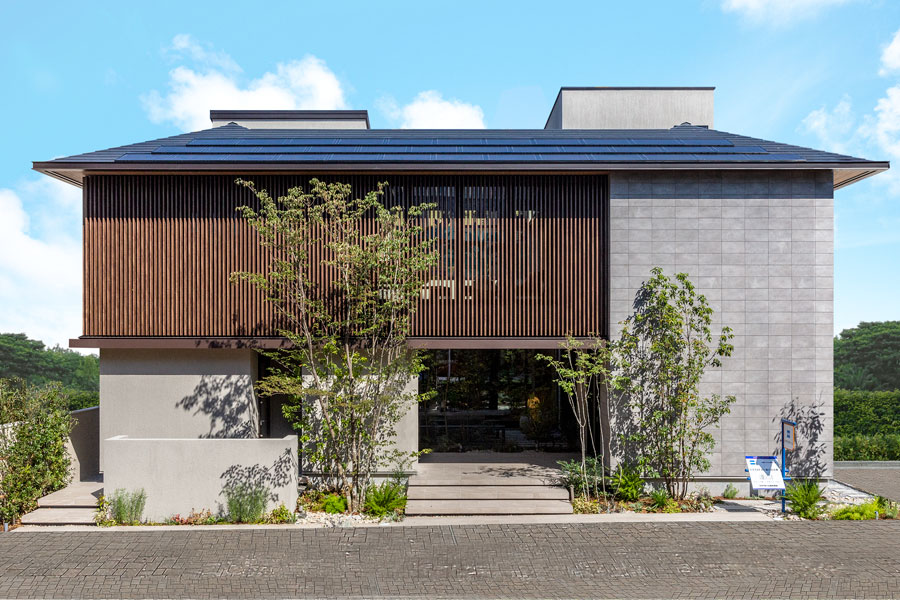 「自然がもらたす心地よい日常」をテーマに中庭が特徴的なウチとソトが一体となった心地よい空間をぜひご体感ください。高天井リビング、大収納「蔵」もご覧いただけます。