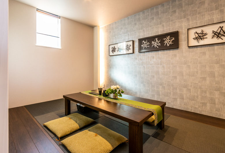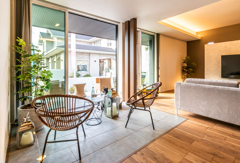 シンメトリーの絶妙なバランスを持つ外観が独特の美しさを放つ「青葉の森展示場」は、住まいの顔にふさわしい広いL字の玄関が来場者をお出迎え。その奥にあるシューズクロークからファミリークロークを通ってLDKへつながる動線や、アウトドアグッズや自転車などの収納に便利な玄関横のハーフ土間収納、階段下を活用したハーフ収納、天候に左右されることなく洗濯物を干せるランドリースペースなど、我が家に採り入れたくなる数々の提案が目を引きます。2階の寝室から続く小屋裏の書斎、シアタールームも見どころ。