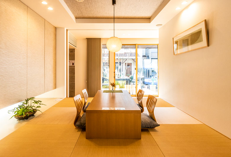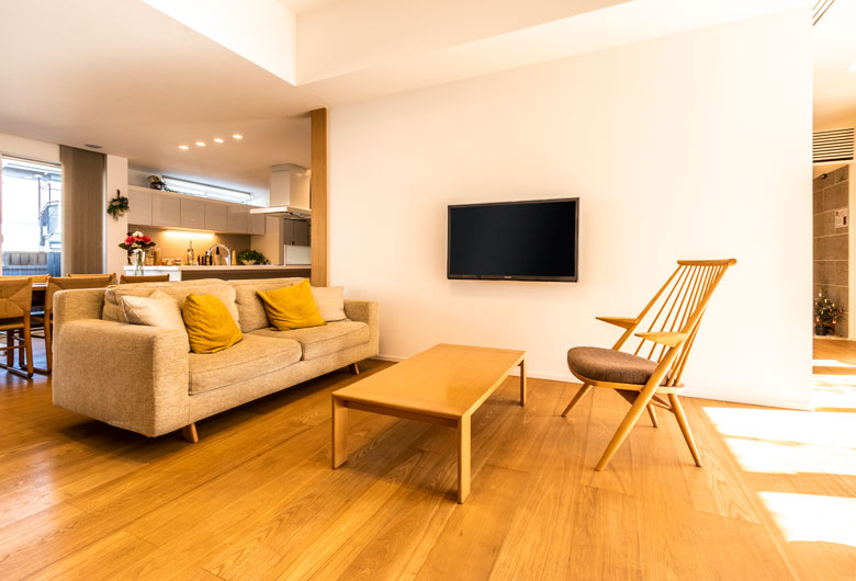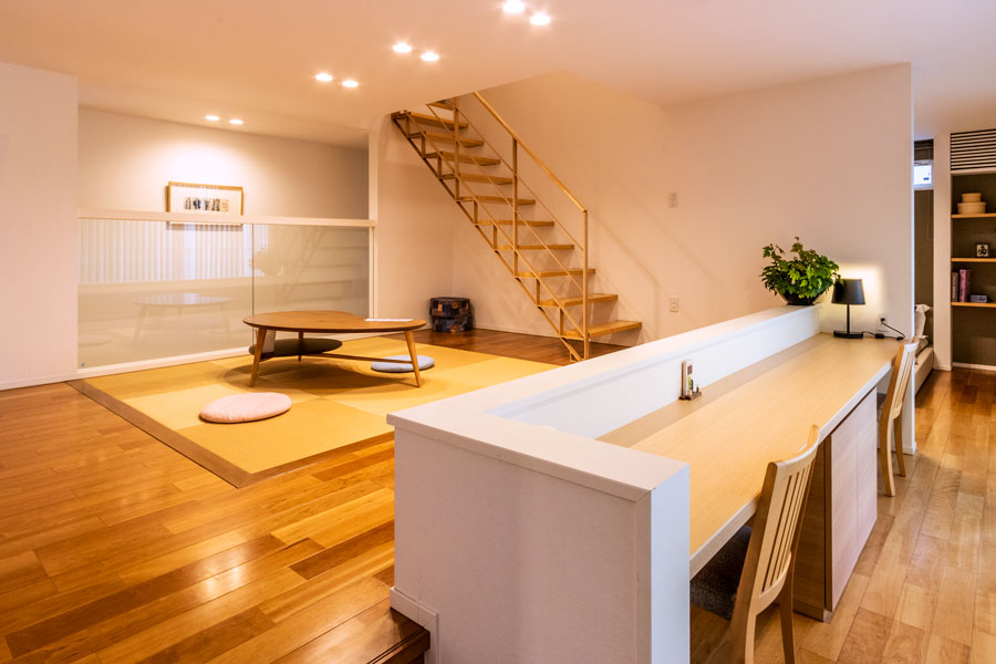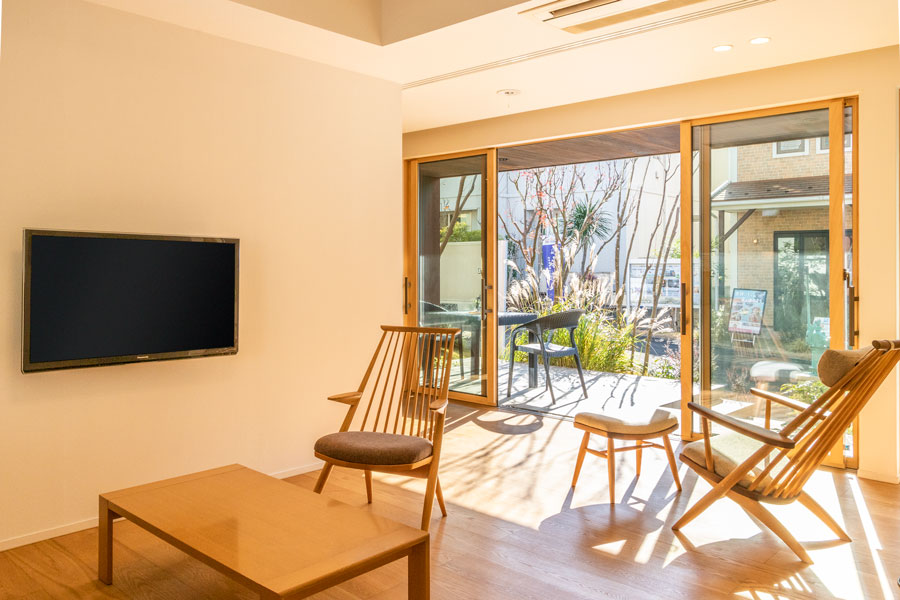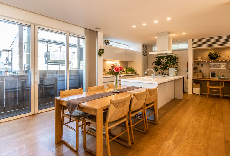 30帖の広々LDK。木造住宅では難しいとされてきた大空間と大開口を構造計算と確かな技術で実現しました。新しい生活様式にもお応えできる要素がたくさん詰まったモデルハウスです。