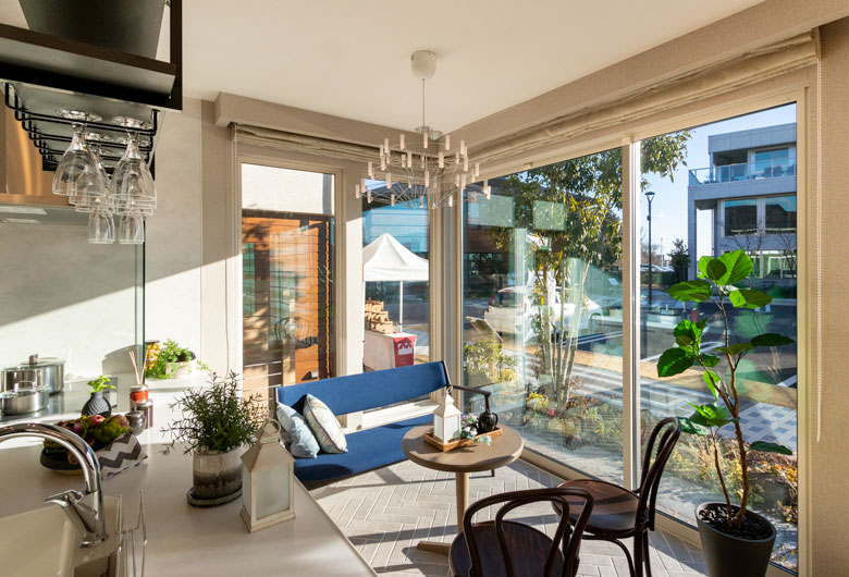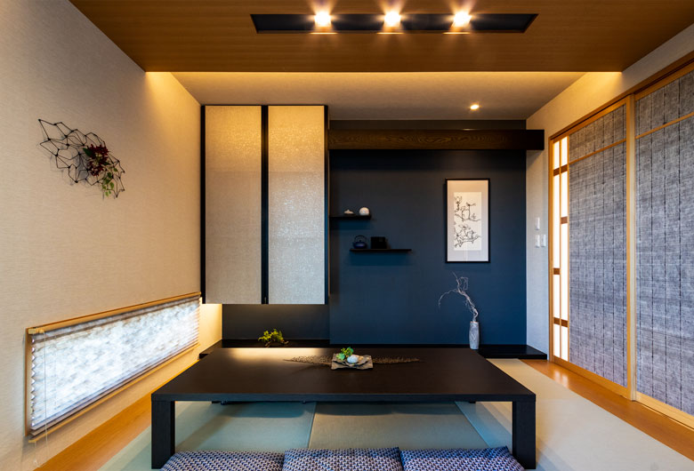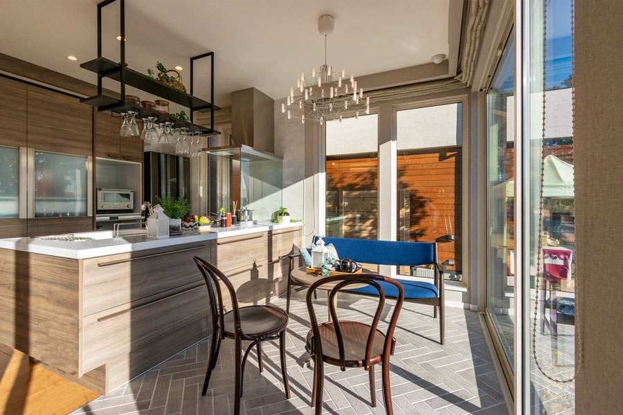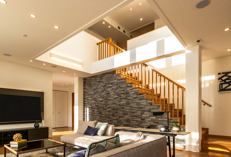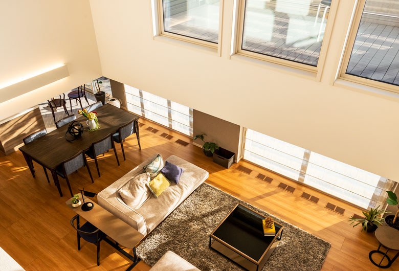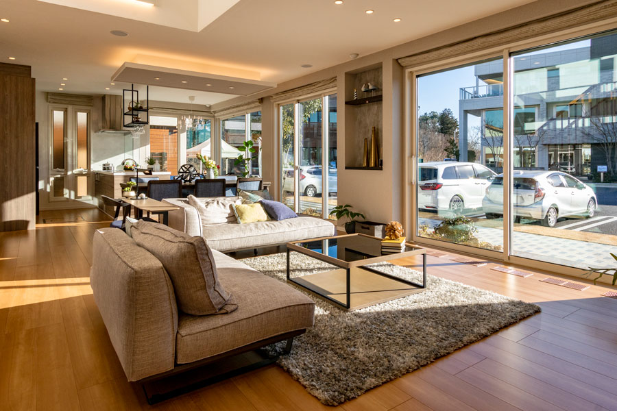 縦横に光が入り明るく開放的なLDKは、家族の幸せな団欒風景をイメージしました。ナチュラルモダンなインテリアは寛ぎと「おもてなしの空間」を演出します。
