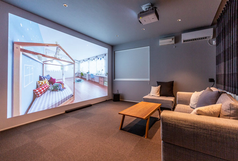 おうち時間を充実させられる圧巻の大画面シアタールームや5.1chサラウンドシステムなども合わせてご体感ください。