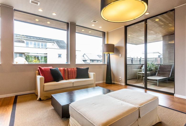 明るく、のびやかな開放感のあるリビング・ダイニングルーム。天井高は最大2.7m、窓には庇のラインにつながる約2.4mのハイサッシ。室内床から段差なく設えたデッキにより、明るさと広々とした視界を確保。