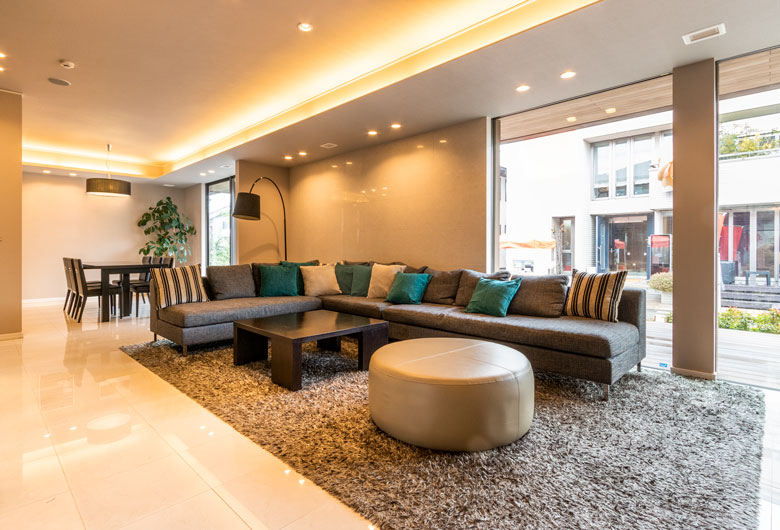 明るく、のびやかな開放感のあるリビング・ダイニングルーム。天井高は最大2.7m、窓には庇のラインにつながる約2.4mのハイサッシ。室内床から段差なく設えたデッキにより、明るさと広々とした視界を確保。