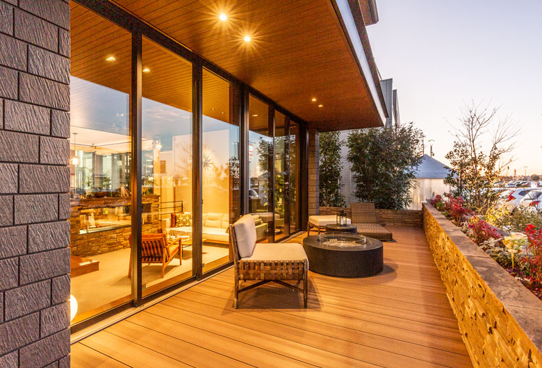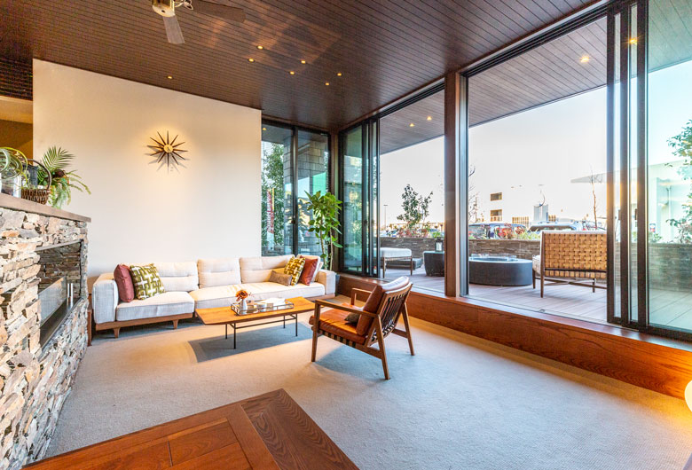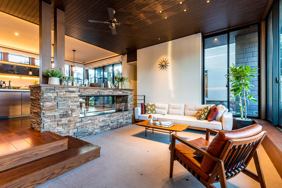 「3.08mの天井高(ロースタイルリビング)」と連続した窓の大空間が醸し出す上質と安らぎ。化粧天井と軒天が繋がることで、木のぬくもりに包まれながらも開放感のある空間を構成しています。