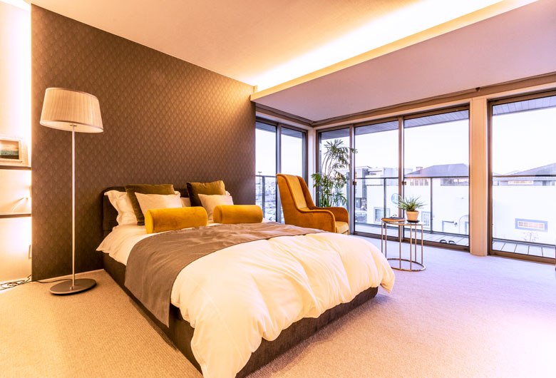 玄関から直接アプローチできる離れ感覚の和室、使い勝手の良い回遊動線、カーペットを敷き込んだ上質感のある主寝室、さらに設置されたGoogle homeに話しかけるとカーテンや照明、エアコンなどが作動し、IOT体験ができます。