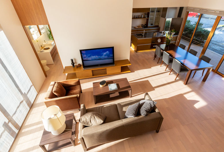 3.5mの明るく開放的な広々高天井リビング。収納量が約3倍になる「蔵のある家」