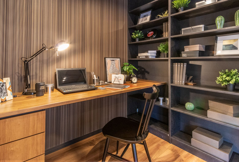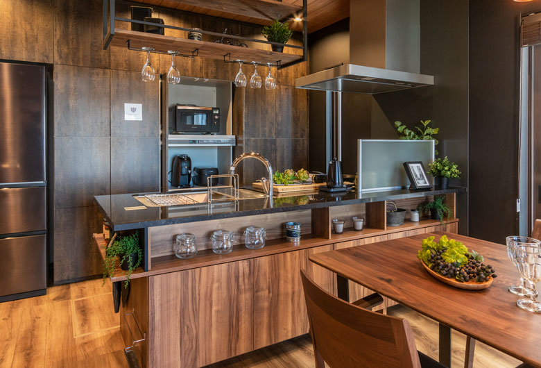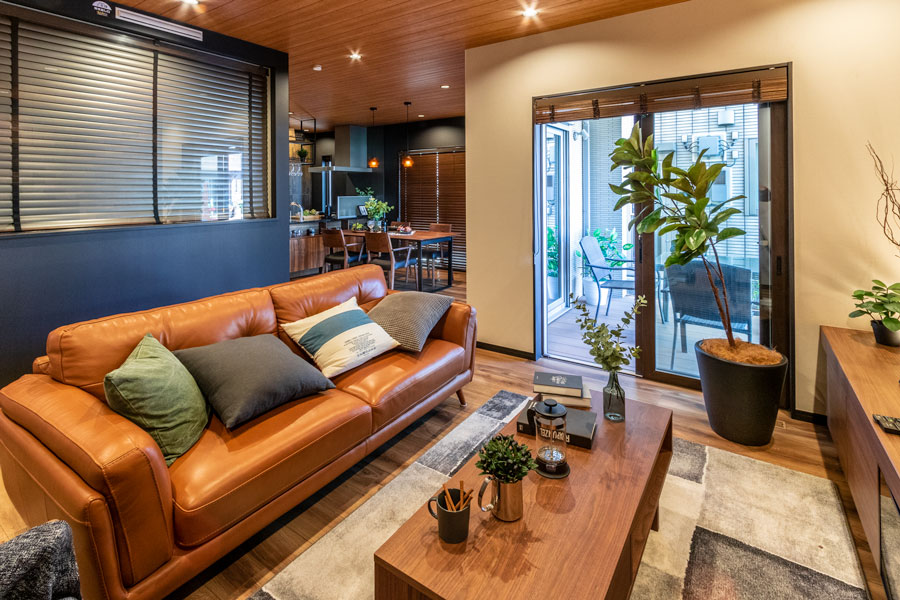 大きな切妻屋根に横格子がアクセントになった都会的な外観。ウッドデッキや庭と繋がる開放的なリビングに対して、格子で目隠しされたバルコニーや小屋裏空間を利用したアトリエなど、開かれた空間とプライベートな空間を併せ持つことで、家で過ごす時間を特別で充実したものにします。