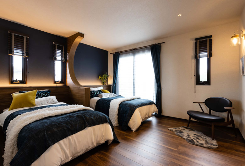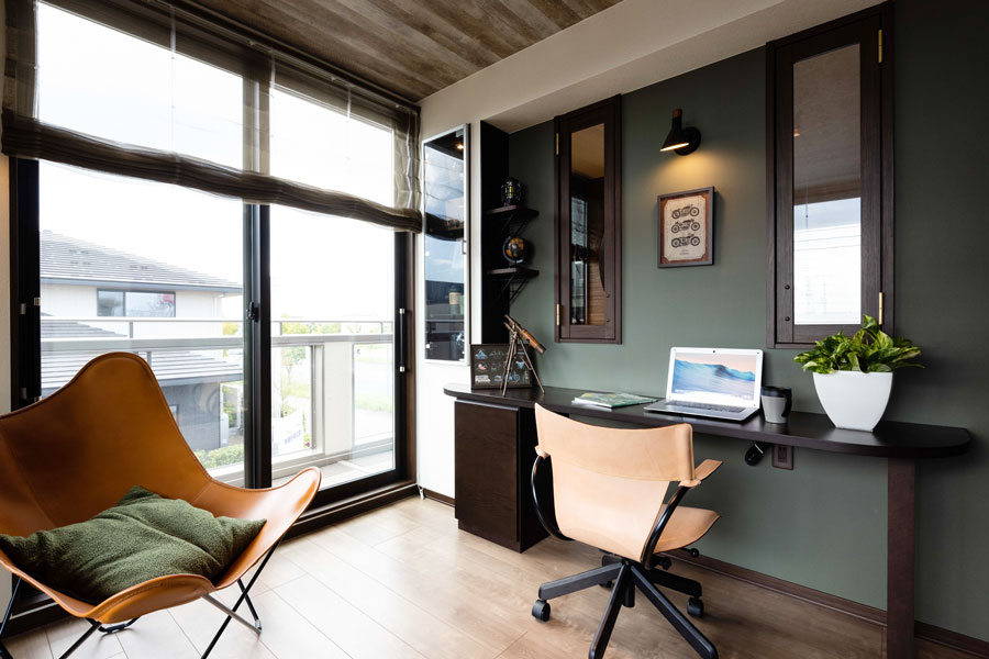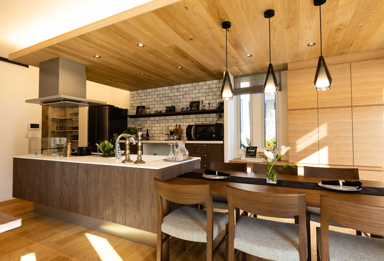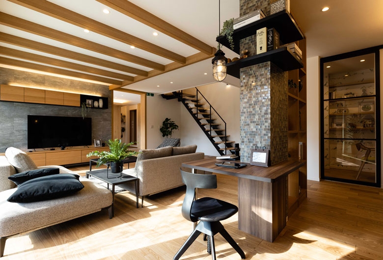 家族と過ごす、休む、仕事をする、リフレッシュするといった、多彩な生活シーンを心地よくする工夫にあふれた間取りの展示場となっております。内装も木パネルやタイル、化粧梁をしつらえたナチュラルテイストに、モノトーンのアクセントをプラスして、上質なライフスタイルにふさわしい空間をインテリアで演出しております。外装も高級感、重厚感に溢れた総タイル外壁となっております。また、幅5.4mの大開口と35.7畳のLDKが演出する抜群の解放感あるLDKをぜひご体感ください!
