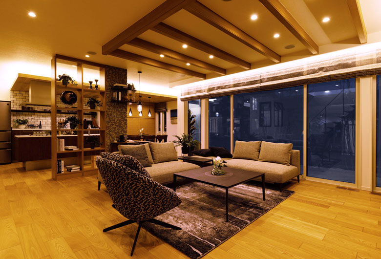 家族と過ごす、休む、仕事をする、リフレッシュするといった、多彩な生活シーンを心地よくする工夫にあふれた間取りの展示場となっております。内装も木パネルやタイル、化粧梁をしつらえたナチュラルテイストに、モノトーンのアクセントをプラスして、上質なライフスタイルにふさわしい空間をインテリアで演出しております。外装も高級感、重厚感に溢れた総タイル外壁となっております。また、幅5.4mの大開口と35.7畳のLDKが演出する抜群の解放感あるLDKをぜひご体感ください!