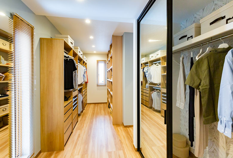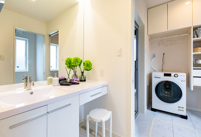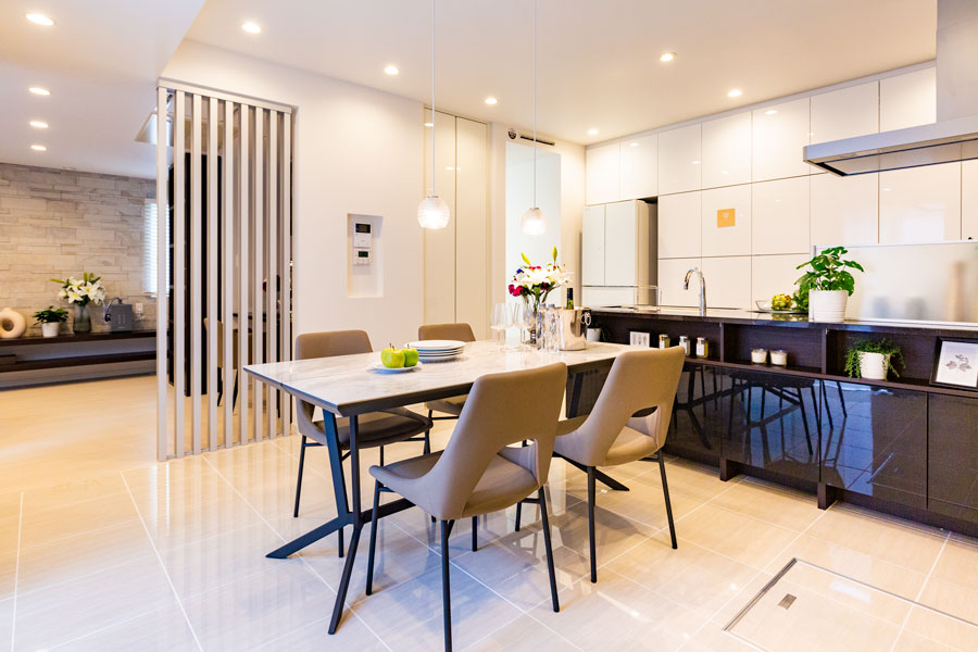 スクエアでスッキリしたデザインが印象的な外観。建物の中心に設けられたパティオは周囲からの視線を遮りプライバシーを守る特別な空間です。さらに屋上の青空リビングはよりプライベートで使いやすい空間を実現。大切な人と開放的な時間を過ごせます。2階のブティッククローゼットは家族分の収納に2面の全身鏡のあるフィッティングスペースを設計。これから始まるマイホームづくりと新生活をより豊かにするための具体的なアイデアがたくさん詰まった展示場を楽しみながらゆっくりと体感してください。