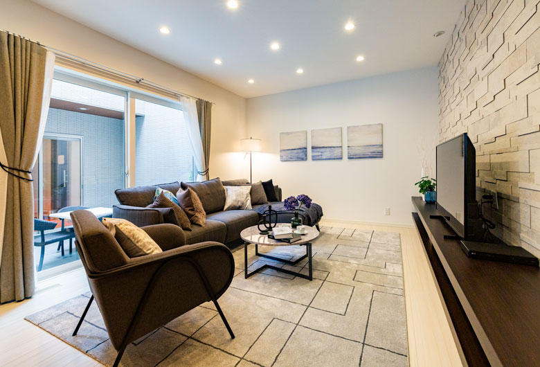 スクエアでスッキリしたデザインが印象的な外観。建物の中心に設けられたパティオは周囲からの視線を遮りプライバシーを守る特別な空間です。さらに屋上の青空リビングはよりプライベートで使いやすい空間を実現。大切な人と開放的な時間を過ごせます。2階のブティッククローゼットは家族分の収納に2面の全身鏡のあるフィッティングスペースを設計。これから始まるマイホームづくりと新生活をより豊かにするための具体的なアイデアがたくさん詰まった展示場を楽しみながらゆっくりと体感してください。
