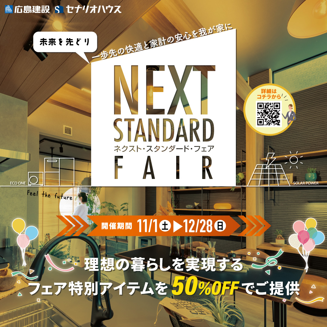 広島建設セナリオハウスでは、11月1日(土)~12月28日(日)の期間でネクスト・スタンダードフェアを開催中!