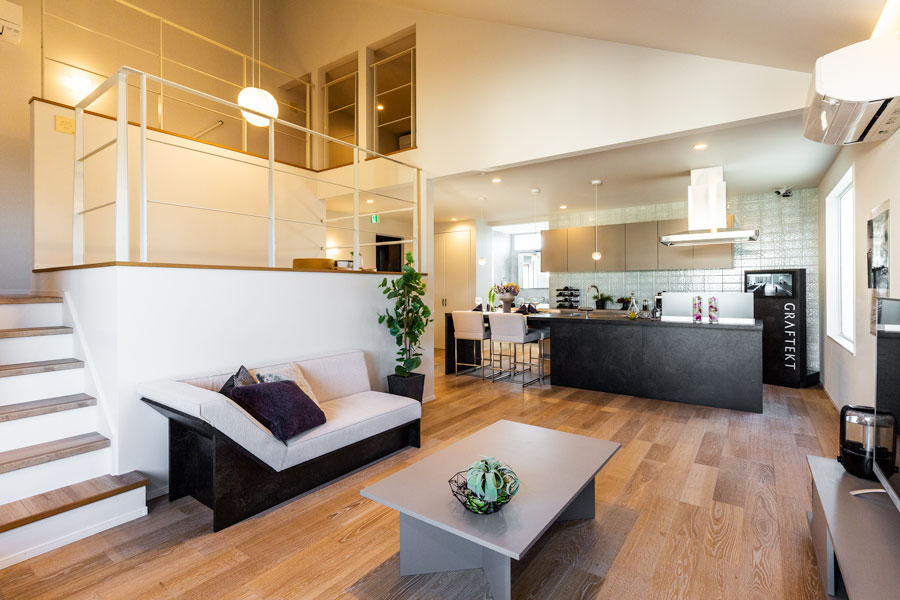 アーバン棟とシンプル棟の2つの建物を同時に体験できます。アーバン棟は家族の会話が弾む造作ベンチ付きのダイニングキッチン、リビングには1.5階の吹き抜けがありキャットウォークが続いています♪シンプル棟はリビングを一望できる読書や勉強にぴったりなスキップフロア、洗練された佇まいのオープンキッチンが魅力です!他にも玄関ホールの洗面コーナーや見比べられる4つのワークスペース、中2階のマルチスペースなど、新しい生活様式を想定したアイデアを各所に採用!ぜひ、お気軽にお越しください。