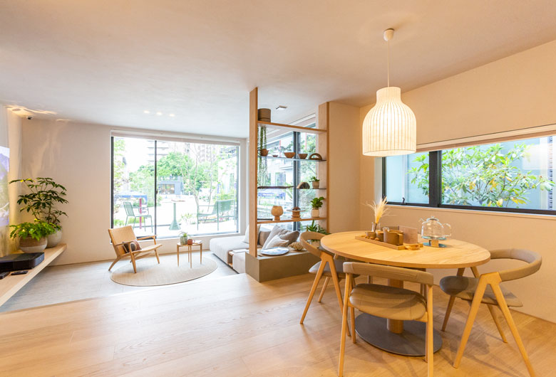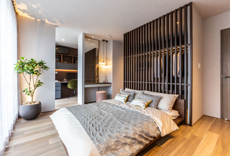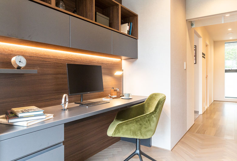 柱と梁からなる強靭な「重量鉄骨・システムラーメン構造」と「ALCコンクリート[ヘーベル]」で包み込まれた大空間が広がります。天井や床の高さに変化をつけることで、バリエーション豊かな空間を実現。1棟の中に邸宅・リアルサイズ・賃貸併用と3種のモデルを体感できるモデルハウスです。フロア毎に異なるインテリアスタイル、ワークスペース、使い勝手の良い収納計画、IoTとレジリエンスを併せた最新鋭の設備など、今のお住まいづくりに必要なものがすべてご覧頂けます。