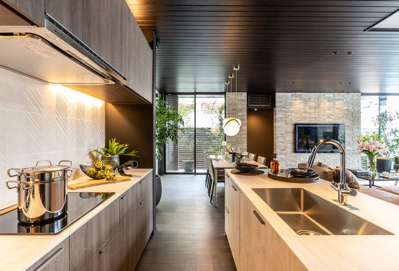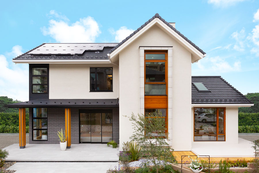 おおらかな寄棟屋根、豊かな陰影を刻む深い軒、風格と奥行きのある住まいに、内外をひとつにする「クリアビューデザイン」がこの上ない開放感を描き出します。豊かに自然と繋がる新しい日本の邸宅です。