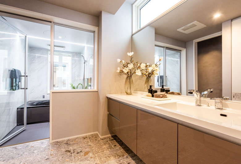 1階の大空間LDKから、階段吹抜けに繋がる1階スキップにスタディーコーナーをレイアウト。適度な距離のとれる、家族の「イドコロ」を各所に計画しました。2階ユーティリティーとフルフラットバルコニーの一体感あるつながりも体験いただけます。仕切りのない大空間をワンフロアから家じゅうに。さらにはウチからソトへ。おうち時間を、もっと楽しもう。家族がつながりながら、それぞれの時間も楽しめる。ファミリースイートが、さらに進化しました。